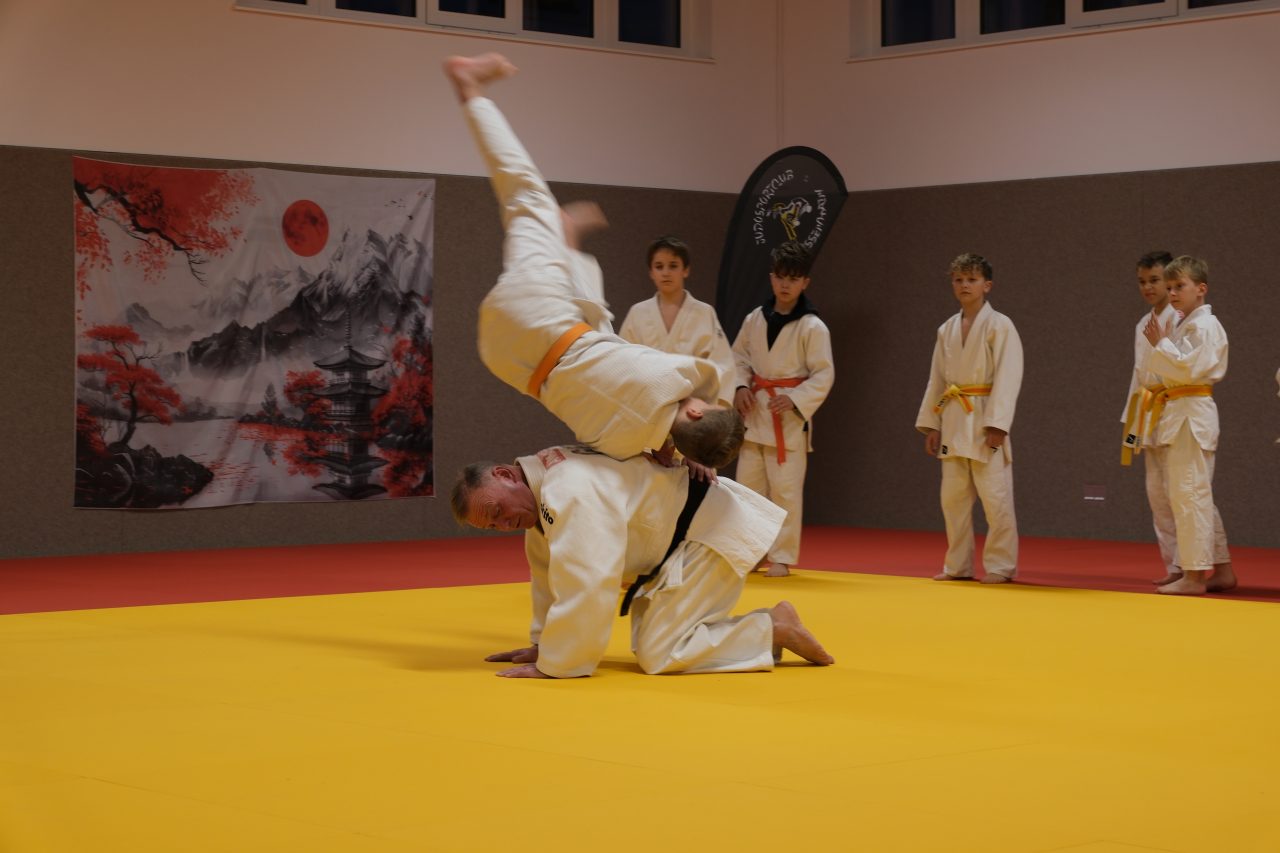 Nach den Reden folgte eine beeindruckende Vorführung, bei den die Judokids und die Erwachsene Judoka ihr Können präsentierten. Die Kinder zeigten mit Begeisterung und Engagement verschiedene Techniken und Würfe, was die Freude und den Stolz auf ihre Fortschritte widerspiegelte. Die Erwachsenen demonstrierten fortgeschrittene Techniken und Kata, was die Vielseitigkeit und das hohe Niveau des Vereins unterstrich. Die Vorführung wurde von den Zuschauern mit großem Applaus begleitet und sorgte für eine festliche Atmosphäre.
